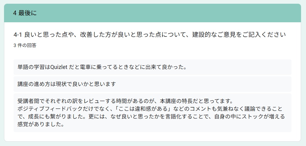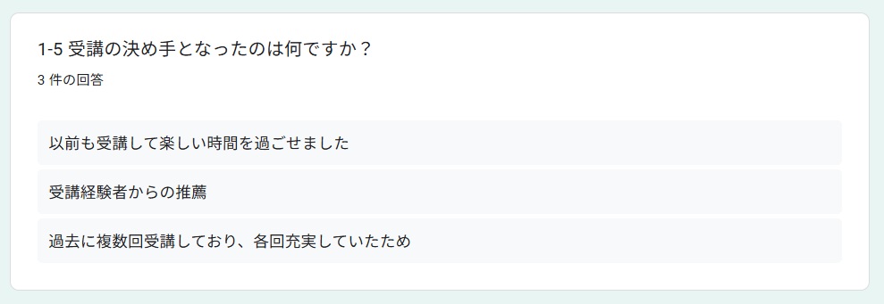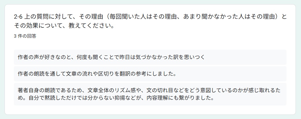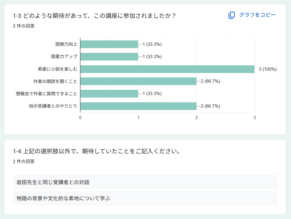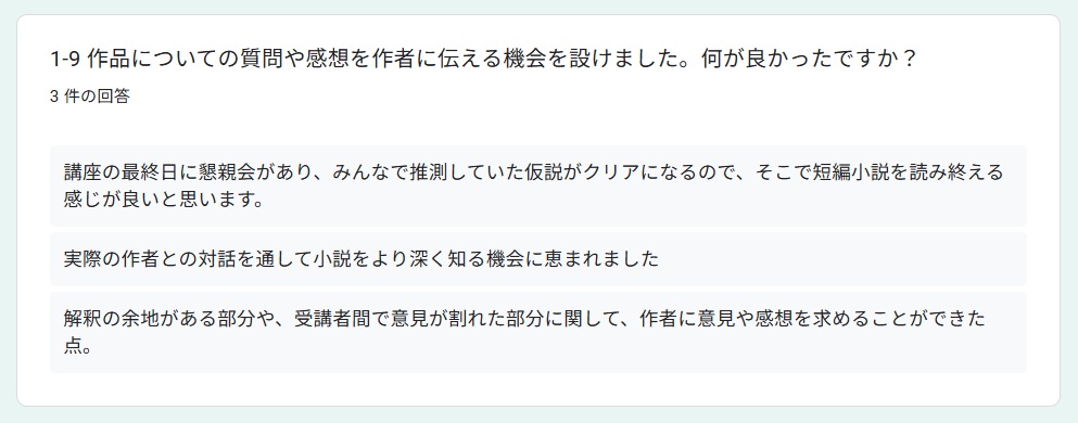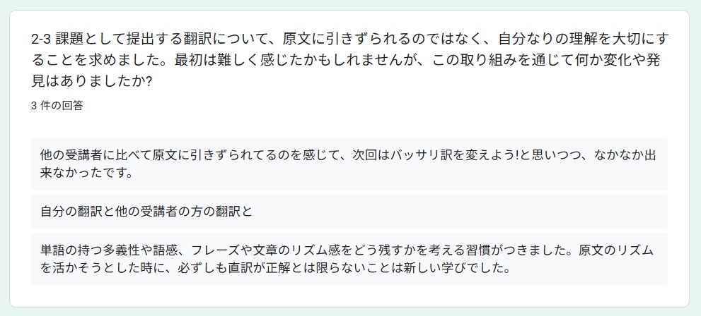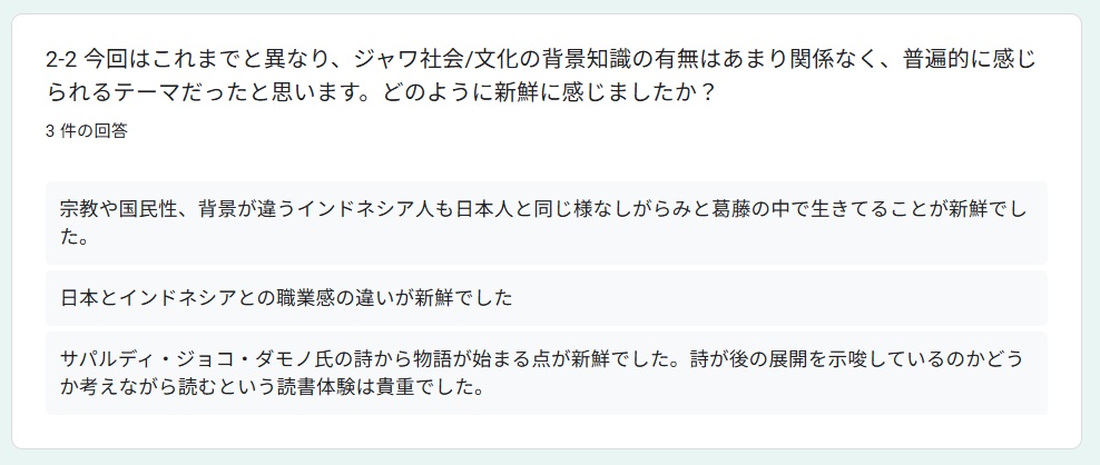受講者アンケートより~2025夏「短編小説を読む」By 岩田 晶子 / 2025-12-31 2025夏「短編小説」 いろいろと追われているうちに大晦日になってしまいました。「短編小説」の夏講座は2025年8月~9月に実施しました。 受講者は、魚躬圭裕さま(30代男性)、上博文さま(50代男性)とMさま(40代女性)の3名でした。 期待 2名はリピーターです。1名は春期に他の講座を受講され、受講仲間の紹介で受講を決めました。全員が「素直に小説を楽しむ」を選ばれていたのは、素直に嬉しいです。教材ではありますが、短編小説は作品ですから、やはり、まずはそのまま楽しんでいただきたいですね。「他の受講者とのやり取りが楽しい」、「作者自身の朗読を聞くことができる」ことも、この講座の特徴のひとつですね。作品にはテーマがあるので、作品を読む過程で自分が知らなかった物語や文化的背景を知るとテーマの楽しみ方が増えて面白いと思います。 受講の決め手 「過去に受講して充実していた、楽しかった」という意見がありました。楽しさの理由は、「ああ!」という発見があるからではないかと思います。他の講座と比べると、「短編小説を読む講座」は受講中に衝撃があり、その後、大きな気づきがあるようです。「聞いたことがある単語ばかりの文でも、改めて日本語にしようと思うと、今までどうやって理解していたのか分からなくなった」。初めて受講された方は、大抵そのようにコメントされます。「だから難しい」と。その後、「インドネシア語の読み方が変わった」、「インドネシア語の表現を考えるようになった」、「わかりやすい日本語を考えるようになった」と言われます。今回初めてこの講座を受講された方は、秋期講座として他の講座を受講されていますが、インドネシア語文の作り方が一段上がりました。想定していた以上の変化が見られたため理由を伺ったところ、短編講座は大変だったけれど、受講後に、「ああ、インドネシア語ってこんなふうにできているんだ」と思えるようになったからではないか、とのことでした。楽しく感じるもうひとつの理由は、作品を丸ごと味わうからかもしれません。「次はどうなるんだろう?」とワクワクします。時には期待通りに展開せず、肩透かしを食らうこともあると思いますが、このワクワク感もポイントかもしれません。 期待満足度 受講前の期待として「読解力の向上」を期待していた人は1人しかいませんでしたが、結果として、3名全員が、読解力向上を感じていました。また、全員が「懇親会で作者に質問できること」にも満足していました。受講者が説明できない個所があれば私がサポートしますし、何といっても、他ではなかなかない企画で、楽しいですよ!「素直に小説を楽しむ」を3人ともが期待していたのに対して、受講後は「ややそう思う」が2人だったのは、課題提出に苦労したからではないかと思います。「短編講座」は、毎週ZOOMの講座が4-5回あります。その間に、全員が、課題を2時間以上かけて日本語にしていたそうです。なかなか日本語の落としどころが見つからず、「素直に小説を楽しむ」どころではなかったのかもしれません。 懇親会の魅力 Satmokoさんの作品は余白が多く、さまざまな解釈の余地があるので他の受講者との議論が活発になります。しかし、この講座の特典は何といっても、気になる部分について、直接作者に質問できることです。作者自身も、私たちが何に疑問に抱いたのか聞くのを楽しみにしていて、「面白い!そういう解釈もあるね!」と言うこともあります。今回は、この作品のインスピレーションをどこから得たのか、などそれぞれの解釈や疑問点だけでなく、執筆に関する質問も出ました。また、ZOOM懇親会の際に受講者のひとりがかぶっていたブランコン(ジャワの男性が被る帽子)を見て、次回はそれをテーマに書こう!とも言っていました。さあ、本当にBlangkonという作品が出来上がるでしょうか、、、。 内容について、、、 Satmokoさんの作品には、ジャワの生活を庶民の目線で切り取った作品が多いのですが、今回は珍しく、「ジャワ」を感じさせない作品でした。それだけでなく、今回はインドネシア語を理解すると、「わかる、わかる!」と共感しやすい内容でした。コメントは、以下の通りです。ちなみに、サパルディ・ジョコ・ダモノ氏は2020年に亡くなったインドネシアの有名な詩人です。宗教や国民性、背景が違うインドネシア人も同じようなしがらみと葛藤の中で生きていることが新鮮日本とインドネシアとの職業観の違いが新鮮サパルディ・ジョコ・ダモノの詩から物語が始まる点が新鮮詩が後の展開を示唆しているのかどうか考えながら読んだ 課題について 私は、講座の中で「正解はこれです」と言うことは多くありません。正解を教えてもらいたい人は多いのですが、正解が一つあるということは、それ以外はすべて間違いなのでしょうか。「回答例が一つ」が成り立つのは、文脈があまり重要
