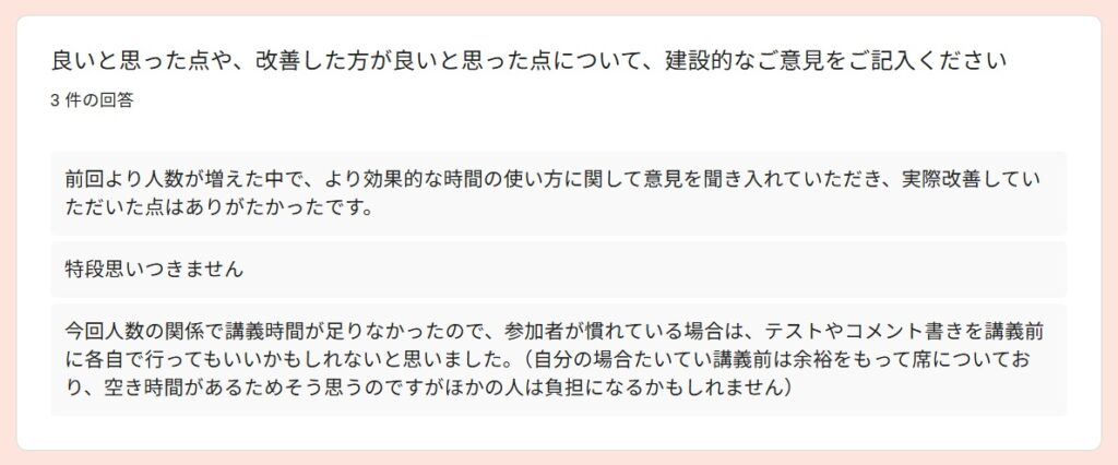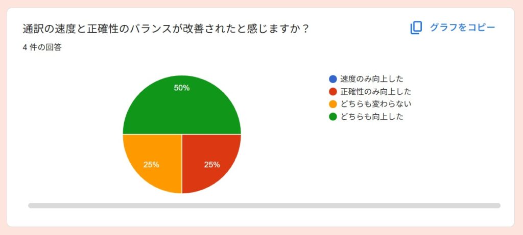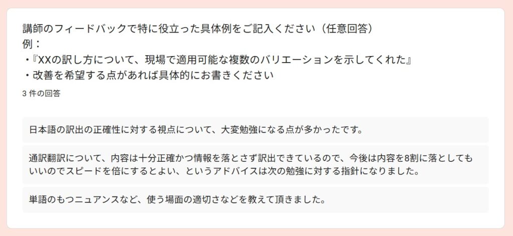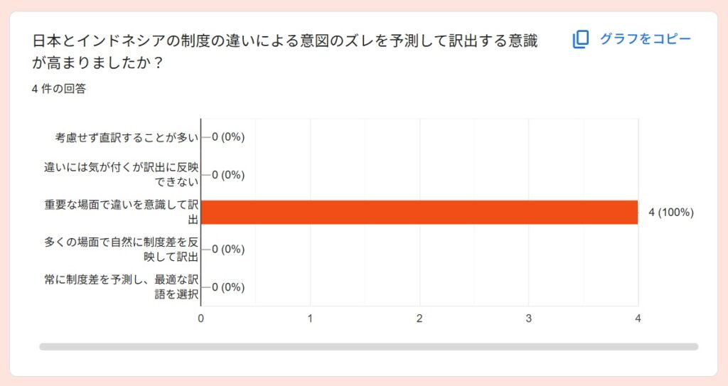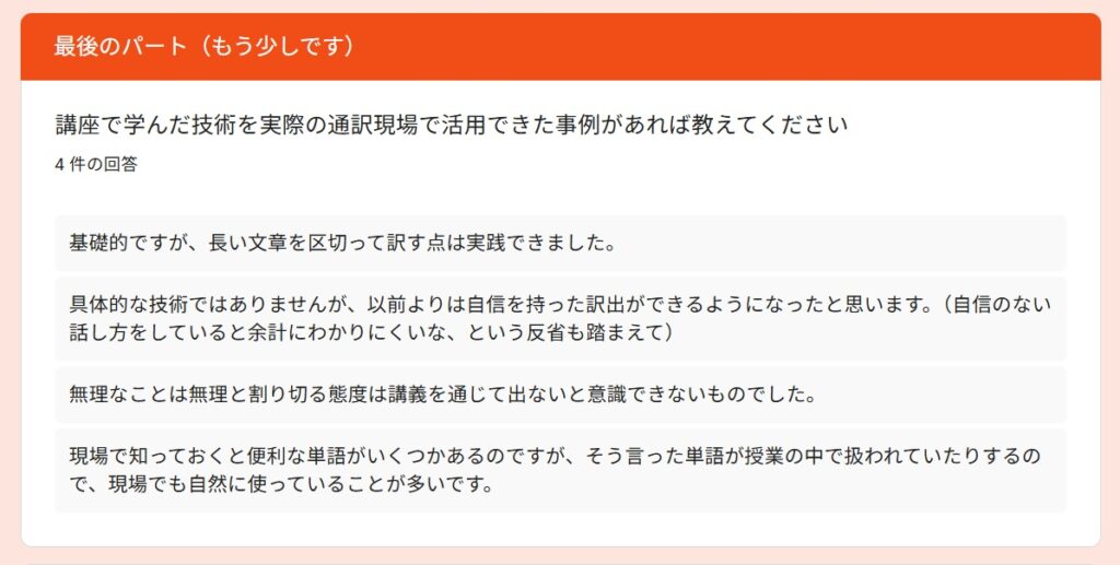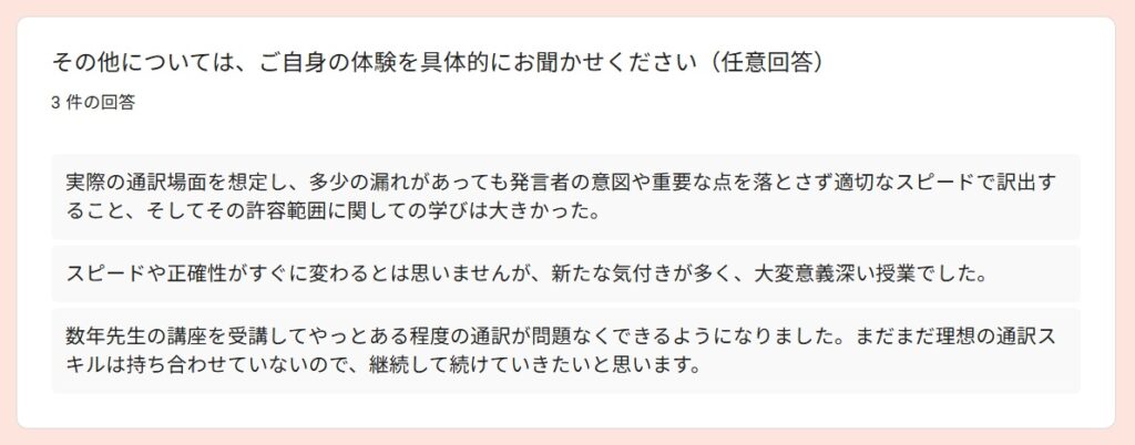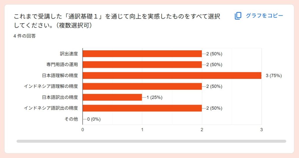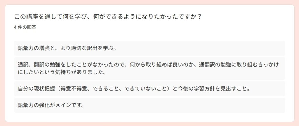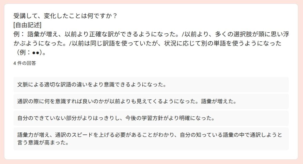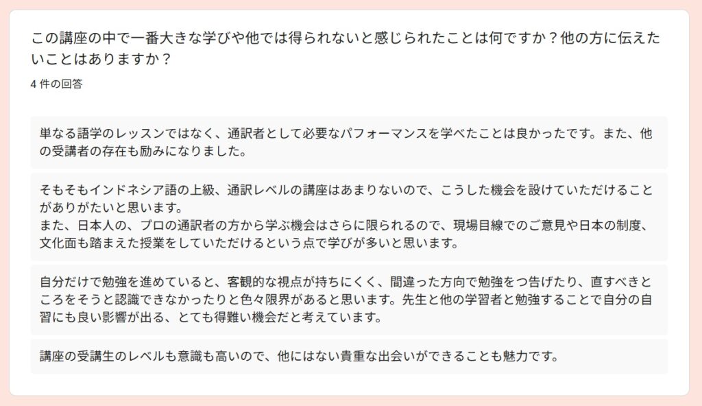 受講者アンケートより~2025秋「通訳基礎1」By 岩田 晶子 / 2026-04-06 2025秋「通訳基礎1」の特徴 「通訳基礎1」の秋期講座は、2025年10月から2026年2月に実施しました。受講者は、フリーランス通訳者Aさん、(40代)、フリーランス通訳者Bさん(40代、女性)、Yさん(30代、女性)、会社員Cさん(20代、女性)の4名でした。新規がお一人、ほか3名は継続受講者でした。 期待 アンケートからは、語彙力強化(2)より適切な訳出現状把握と今後の学習方針を明確にするため通訳の勉強をしたいという期待があることが分かりました。 受講して変化したこと 受講して変化したことを毎回質問しています。通訳力がみるみる向上する、ということはないと思いますが、意識が変わることで確実に向上していくものはあります。文脈による適切な訳語の違いをより意識できるようになった通訳の際に意識すべきものが前より明確になった語彙が増えた(2)できていない部分がより明確になった➡今後の学習方針に役立てる通訳スピードをあげる必要性がわかった日頃から「文脈による適切な訳語の違い」を意識する重要性を感じているので、それが伝わっていることが分かり、嬉しく思いました。 通訳速度と正確性 上の回答にもありましたが、「通訳速度をあげる必要性」については、今回初めて指摘したかもしれません。速度と正確性はトレードオフの関係になる場合もありますが、インドネシア語通訳のケースでは、比較的速度が遅めのことが多いので、正確性を維持しつつ速度をもう少しあげることは可能だと考えています。意識の問題だと思います。ざっくりとした訳をしがちな方には正確性を意識し、正確であることに捉われがちな方には、速度を意識してもらい、最終的にはバランスがとれるようになると良いと思います。 制度の違い 通訳レベルにはさまざまな段階があると思います。その中でも、制度の違いを意識して訳出することは、難しく、同時に大切なことだと考えています。字面通りに訳しても分からないのは、それが直訳だからというより、制度の違いを認識せずに訳出するケースも多いのではないでしょうか。トピックになっている制度に関する予備知識がない場合は字面通りに訳すことになりますが、ある程度予備知識があるのであれば、少し工夫することができますね。今回の回答は、「重要な場面においては、制度の違いによる意図のズレ」まで予測することができたと、4名ともが回答していますので、素晴らしいことだと思います。一度できるようになれば、他の場面でも応用できるようになると思います。 向上した力 以下の質問は、今回の秋期講座を含め、過去の「通訳基礎1」を通じて向上を実感したものについて質問したものです。訳出速度、専門用語の運用、日本語理解の精度、インドネシア語理解の精度、日本語訳出の精度、インドネシア語訳出の精度が選択肢にあります。この中で「日本語理解の精度」が一番高いという結果は、講師としてとても嬉しいものでした。日本語話者にとって「通訳力の向上」というと、日本語理解の精度の重要性は優先順位が下がりがちですが、通訳をやればやるほどその重要性を実感します。 「その他」は自由記述にしました。通訳は即時性が求められるため、「漏れ」の中身にもよりますが、「多少の漏れ」というのは許容範囲に含まれると思います。第三者に判断してもらうと、その感覚がつかめるのではないかと思います。通訳が遅い理由の一つに、すべての情報を翻訳してから訳出しようとすることが関係しているかもしれません。 講師によるフィードバック フィードバックは、各受講者が担当した通訳に対して行っているので、他の人にそのまま当てはまるわけではありませんが、以下のようなコメントがありました。 実際の通訳場面で、、、 実際にどのような技術を活用できたのか、質問しました。長い文章になると、メモしている間にまとまらなくなって、訳出した文が原文よりかなり短くなってしまうことがあるかもしれませんが、「長い文章を区切って訳す」というのは、対応できるようになったということですね。自信を持った訳出、というのも大事ですね。通訳をする場面での話者には、「自信をもって話す立場」の方もいらっしゃいます。そのような場面で、通訳者が自信がなさそうに通訳をするのは適切ではないですね。「無理なことは無理と割り切る態度」。これは大事です。私たちは人間です。スーパーマンではありません。同時通訳で、話者が話し始めているのに、通訳者がまだ話し出さない、という意見をいただいたことがあるのですが、人の心を読めるわけではないので、同時通訳といっても少し遅れて訳出するものです。原稿があり、事前に共有されており、話者が原稿通りに話すのであれば、同時に話し始めることもできますが、原稿があったからといって、話者が原稿通りに読上げるとは限りません。文化、制度、知識、笑いの対象や背景