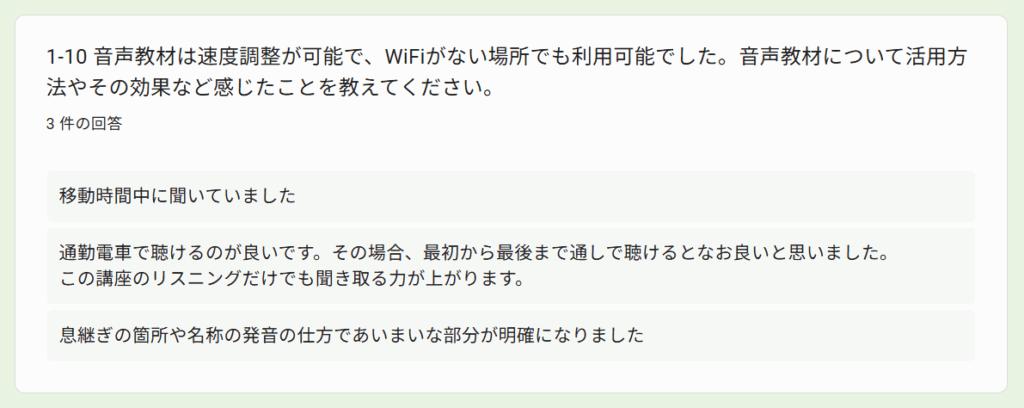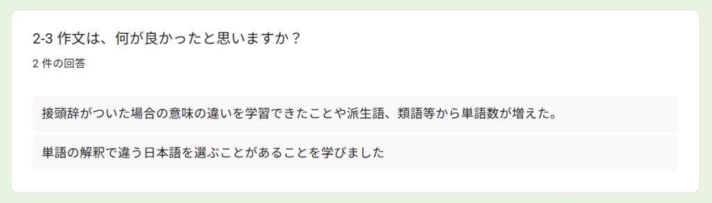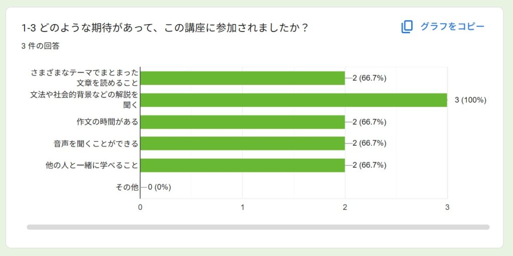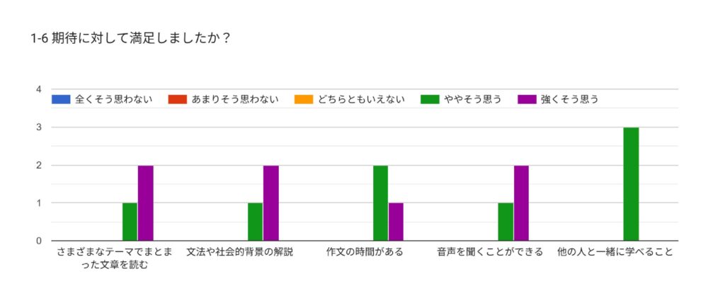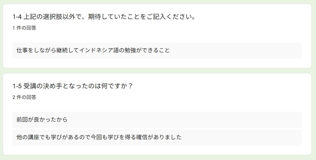 受講者アンケートより~2025秋「総合講座」By 岩田 晶子 / 2026-04-13 2025年秋「総合講座」は Aさん(50代)、Kさん(女性、50代)、Mさん(女性、40代)の3名で実施しました。2名がこの講座のリピーターです。1名は、文を文を読み解く時間を取るという目的で、他の講座からこちらの講座を受講されました。 期待 3名ともさまざまな期待を持って受講されましたが、なかでも、「文法や社会的背景などの解説を聞く」は全員の関心が高かったことが分かりました。今回の受講者は3名とも、インドネシアの社会文化を深く知ったうえでインドネシアの人と接したいという気持ちが強い方々だからではないかと思います。2025年春講座では講座の後半で扱う課題について「作文」をメインにしていました。そのため、リピーターの方からは作文についても期待していたことが分かります。 その他の期待と受講の決め手 「講座への期待」の自由記述には、仕事をしながら継続してインドネシア語の勉強ができること、というご意見がありました。この講座だけでなく、私の講座の受講者には、平日フルタイムで仕事をされている方が半分以上います。他は、フリーランスの通訳者、学生、主婦の方などです。時間の調整が難しい受講者の方にも継続していただけるよう、できる範囲で工夫しています。独学での継続は難しいけれどできれば学び続けたい、という受講者の声を反映し、「総合講座」では録画を後日視聴できます。そのため、欠席した日や復習用に役立てていただけます。「受講の決め手」については、前回が良かったから、他の講座でも学びがあるので、という回答がありました。 期待に対する満足度 期待に対する満足度は、概ね高いと言えると思います。「作文の時間がある」は、私の質問が不適切でした。2025年秋期は、語彙増強をメインにしたので、本来は質問を変えるべきでした。2026年春期講座では、各自が「作文」か「語彙増強」を選べるようにします。 音声教材について 音声教材は、私の録音を聞いていただいています。プロのナレーターではないので、聞きづらい箇所もありますが、ご了承いただいたうえでご活用いただいています。eラーニングコンテンツの仕様では、WiFiがなくても使用可能で、再生速度の調整も簡単にできるものです。そのため、通勤や移動時間に聞くことができる点がメリットです。これまでは音声ファイルを分割していましたが、今回のご意見を反映し、2026年春講座では、通しで聞けるようにしています。「息継ぎの箇所や名称の発音の仕方で、曖昧な部分が明確になった」というのは、参考になるご意見をいただきました。フレーズが長い時はフレーズの流れがないと、読むときにも読みにくく、聞くときにも聞き取りにくいものです。ですから、息継ぎのタイミングを意識すると、読解にも役に立つと思います。 作文の良かった点 上に記しましたが、「作文」は今回は少なくしました。そのため、作文の設問は今回の講座内容に合っておらず、設計ミスでしたとはいうものの、語彙増強も含めて、語彙が増えたり単語の解釈の違いを学ぶことができたりしたことが分かりました。 予習時間は? さて、平日毎日フルタイムでお仕事がある方々の予習時間をみてみましょう。各受講者の読解力や語彙力によって学習時間がことなるものなので、参考としてご覧ください。2時間程度が1人、2時間以上が2人です。 復習時間は? 復習時間も、各自の学習の目的や達成目標、その時の余力によって異なりますので、こちらも参考としてご覧ください。 2026年春「総合講座」では 春期講座も、秋期と同じスタイルで進めます。インドネシア語を読んでいるけれど理解できているか自信がない方や、どこでつまずいているか分からない方にも、ぜひ参加していただけたらと思います。