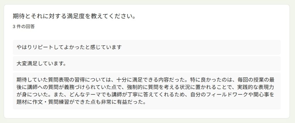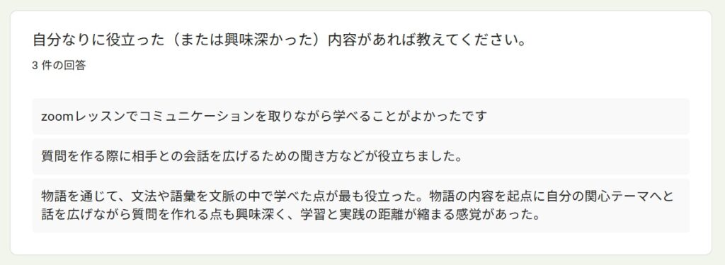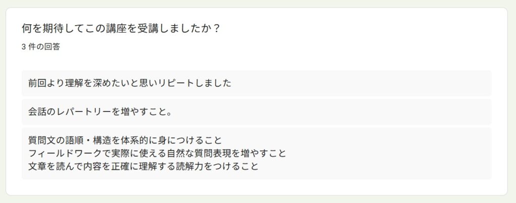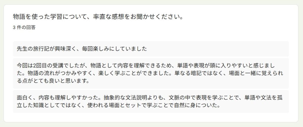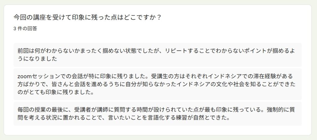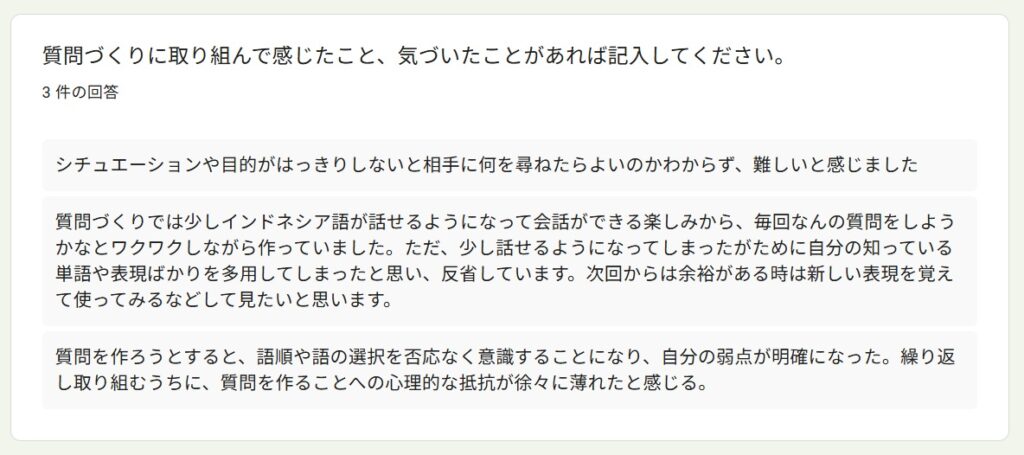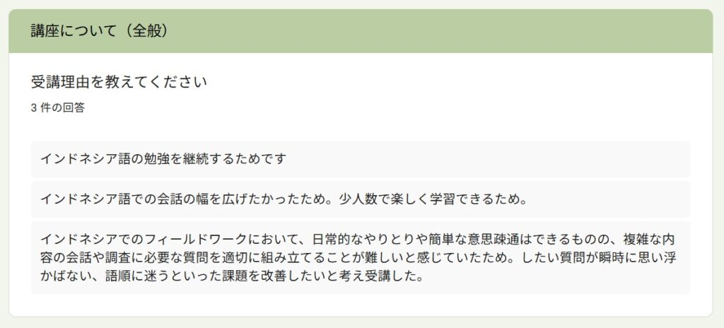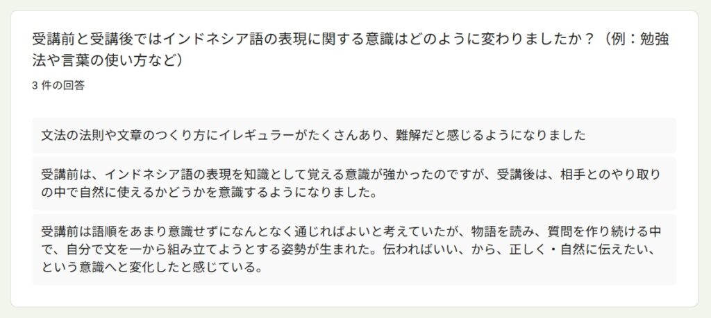 受講者アンケートより~「読んで学ぶ文法&質問力」By 岩田 晶子 / 2026-04-13 2025年秋「読んで学ぶ文法&質問力向上」の特徴 今回の受講者は、前回からのリピーターのR.I.さん(50代)、Y.Y.さん(大学院生、20代)、K.I.さん(大学院生、20代)の3名でした。 前回に引き続き、東ティモールやインドネシアのフローレス島などを訪問した私の旅行記を中心に学びました。前回は、構文を考えながら読むことを目標にしました。今回は音声教材を準備したので、耳から聞いて学ぶこともできるようになりました。 受講理由 受講理由は、以下のとおりでした。インドネシア語の勉強を継続するためインドネシア語での会話の幅を広げたかったため少人数で楽しく学べるため日常的なやり取りや簡単な意思疎通はできるが、したい質問が瞬時に思い浮かばない、語順に迷うため 期待と期待に対する満足度 期待は以下のとおりでした。前回より理解を深めたい会話のレパートリーを増やしたい質問文の語順・構造を体系的に身につけること実際に使える自然な質問表現を増やすこと文章を読んで内容を正確に理解する読解力をつけること 満足度については、以下のような回答がありました。リピートして良かった大変満足している質問表現の習得は十分に満足した質問を考える状況に置かれることで実践的な表現力が身についた作文・質問練習は自分の関心を題材にすることができて有益だったこの4つ目ですが、これは、そのような状況に置かれれば持ち合わせの語彙や表現を総動員して出すことができる人が、このような状況に置かれれば、実際に組み合わせて話すことができる、ということですね。質問を義務づけることで、持ち合わせの語彙や表現を総動員する状況が生まれます。状況設定がスイッチになるタイプの方には、特に有益な形式だったようです。 講座で印象に残った点 印象に残った点は、以下のとおりでした。前回は何がわからないか掴めなかったが、リピートしたことで分からないポイントが分かるようになった受講者同士の話から、自分が知らなかったインドネシアの文化や社会を知ることができた講師に質問する時間があり、強制的に質問を考える状況に置かれたので、いいたいことを言語化する練習ができた回答にある通り、3人ともインドネシアで専門的&ディープな話題があり、それを元に質問を作るので、話題が広がって私もとても興味深かったです。 物語を使った学習についての感想 私は、学習者用の教材であっても、長文読解や文法の勉強になる一方で、「これってこういうことかな?」と読む人がワクワクするような教材を作りたかったのです。そのため、感想を聞いてみました。旅行記が興味深く、毎回楽しみにしていました2回目でしたが、物語として内容を理解できるため、単語や表現が頭に入りやすかった単なる暗記ではなく、場面と一緒に覚えられる点がとても良い面白く、内容も理解しやすかった抽象的な文法説明より、文脈の中で表現を学ぶことで、単語や文法を孤立した知識としてではなく、使われる場面とセットで学ぶことができた場面と一緒に覚えられたという回答がありますが、これは狙っていたことだったので、そのように伝わったことが嬉しいです。初級を超えると、文法事項を覚えても、使えるようになるまで時間がかかることがあります。そのようなレベルには、私は物語性や文脈があると語学学習のモチベーションを維持しやすいのではないかと思います。 役立った内容・興味深かった内容 コミュニケーションをとりながら学べること相手との会話を広げるための質問の仕方が役立った文法や語彙を文脈の中で学べたことが役立った学習と実践の距離が縮まる感覚があったこの講座は、他の講座より「双方向」の割合が多いので、「コミュニケーションをとりながら学べること」という回答がありました。 質問作りについて、、、 質問作りについて感じたこと、気が付いたことについて、以下の回答がありました。シチュエーションや目的がはっきりしないと相手に何を尋ねたらよいかわからず、難しかった毎回なんの質問をしようかなとワクワクしながら作っていた知っている単語や表現を多用してしまったので、次回は新しい表現を使ってみたい質問を作ろうとすると、語順や語の選択を意識することになり、自分の弱点が明確になった質問を作ることへの心理的な抵抗が徐々に薄れたそれぞれに具体的な気づきが見られました。質問をする上では、何を尋ねたいのかはっきりさせないといけないけれど、それは難しいことである、という気づき。そして、会話であれば、相手が発した言葉を受けて、イエスとかノーとか意思表示をするだけでも会話は続くけれど、質問をする際には、それでは十分ではないことに気が付いた、ということですね。また、いつも同じ単語や表現を使ってしまうというのは、よくあることです。意識しないと、新しい単語や表現は使わないですが、間違